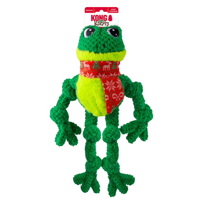 KONG Holiday Knots Frog is dressed for the season! This oversized amphibian’s full-body rope skeleton creates durability & heft for a variety of playstyles like tugging, thrashing, carrying, and gnawing.